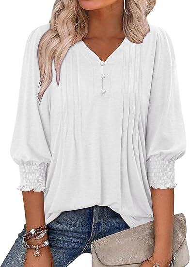 • Trendy Design:This v neck t shirt comes in cute puff sleeves, elastic pleated cuffs, showing your elegant look. V neck, button down design provides an elegant neckline. You can tuck the blouses into your trousers, leisure and fashion