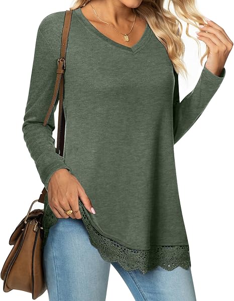 - Features: The ladies long sleeve v-neck shirt has loose bottom regular hem with beautiful lace, could cover up the belly. It is a stretchy blouse to wear with leggings, jeans, coat or jacket, a messenger bag or handbag is also great choices. They can be dressed up or down